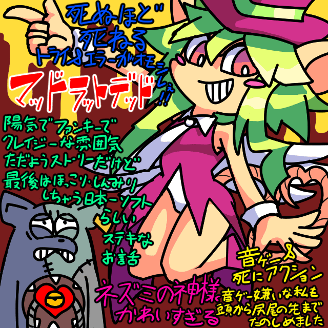 ・過去の日記ログ ・26/03/22 MAD・RAT・DEAT 念願のマッドラットデッドがセールになっていたぞ急げ! ってことで購入&クリア。 リズムに合わせて移動する全く新しいアクションゲーム。 物語は自分を実験で殺した研究者を 神様に貰った時間巻き戻しの能力を使い蘇った主人公マッドラットが殺しにいくという復讐劇。 意思を持つ己の心臓ハートとマッドラットを導くねずみの神様のコメディチックなストーリー。 でも見た目に反して設定はハードだしストーリーも判りやすく伏線や驚きがあって面白い。 ストーリーは一本道で分岐なし、とにかくクリアまで突き進むコンボが気持ちのいいリズムアクション。 難易度はかなり高くあっという間に死ぬのですが、巻き戻しの能力でミスを無かった事にして 針穴を通すような難所をトライアンドエラーで抜けていくのが面白い。 巻き戻してもタイムは戻らないので無限にリスタートできないのも緊迫感があって良い。 最初の難易度洗濯でタイム無限も選べる新設設計。 死ぬ前提のアクションゲームと言えば同社がPSPで出したプリニーを思い出しますね。 残機1000で死にながらクリアを目指すゲームなんですがあちらも名作でした。 日本一ソフトは私の苦手なジャンルを楽しくプレイさせてくれる…最高のデベロッパーやでぇ。 switch版のセールは3/25までなんでお一ついかが? ハナビラ茸のテンプーラ 以前四万温泉へ旅行に行った時に感動した料理の一つに ハナビラ茸の天ぷらがあったので自分でも作りたいと思っていたのですが 中々スーパーで見かける事がなく悶々としていたのですが売ってたので作る。 代行:笹百合と梔子 美味しい…美味しいけど何かが物足りない。 ただ揚げるだけなのになぜこうも違いが出るのか。 何十年もお店やってるお婆ちゃんの作る揚げ物ってめっちゃ美味しいんですよね。 前に草津のバスターミナルにある年期入った食事処で食べた天ぷらも感動した覚えが。 やはりプロは違う、料理好きでもお金をだす価値があるというのがわかりますね。 落書き ※子宮脱とか特殊性癖もいいとこなので、18歳未満のクリックはご遠慮願います。 ↑のお返しのホワイトデー ゲームとLEDが連動!?33年ぶりのFC用新作RPGの開発が始まる! 4STさんがちょっと前に作るといってたRPG、どんなのかなと思って続報を待っていたのですが まさかのゲームの続編で、オラワクワクしてきたぞ! まさか令和の今になってあのゲームの続編が出るなんてなあ。 しかし開発中とはいえ戦闘画面を見た感じオーソドックスすぎて今やって楽しめるのかどうか… 多分その辺りは現在でも楽しめる作りにしてくれることを期待しつつ発売を楽しみに待つ。 ゲーム開発室 終わらない、校正が全く終わらない。 勢いに任せて書いた文章なので目が滑るテキストが多すぎる。 誤字脱字も多すぎる。 スクリプトミスでヤンキーが女の子のセリフも言う。 完成は今しばらくかかりそうです。 あと追加しようと思ったもののすっかり忘れていた外字機能つけました。 付けたのはいいものの、基本的に使いたい文字ってハートくらいしかないんですよね。 エロゲーなのでハートは大切超大切。 拍手レス >エアーズロックも登れなくなったしな。思い立ったが吉日。 知らなかった…そんなの…。 思い立ったが吉日だったのでなんとかズートピア2を公開終了前に見に行く事ができました。 行って良かった…映画館で見れてよかった…名作だった…! あの作品はケモナーなのに未視聴だと罪に問われるといっても過言じゃあななかった。 >隠れるところも最低限は描かないとバランス崩れそうで怖い ラフではちゃんと描くので多分大丈夫なのですが 落書きの一発描きだと隠れている部分はかなり誤魔化しているので 滅茶苦茶ばバランスになっていることが多々あって…ちゃんと書かないとダメですね。 あったでゴザルとかいてますが現行でひどいものでゴザル。 >ポーションにエリクサー混ぜるようなもんだからね。 >クリームシチューにクリームチーズ。 まこと美味しゅうございました。 しかし… むっ、これは…シチュー! 所でクリームチーズって今までお菓子作りにしか使ったこと無かったのですが 何か色々使えそうですね、このエリクサー色んなものに混ぜ混ぜしちゃおうと思います。 >リンジー「この仕事は 悪魔城で興奮しすぎて立ちションしちゃったマクシームの弔いさ!ぶっ殺しておくれ!」 そういえばセリフだけの回想でマクシームが死んだノクターンシーズン1ですが シーズン2まだ見ていないので実は生きていてムッムッホァイしてくれるような話だったらどうしよう。 我々は事実確認の為ネトフリを再契約することにした―スティールボールランの二話が始まる頃に――ッ! ・過去の日記ログ ←コメント等がございましたらこちらを。