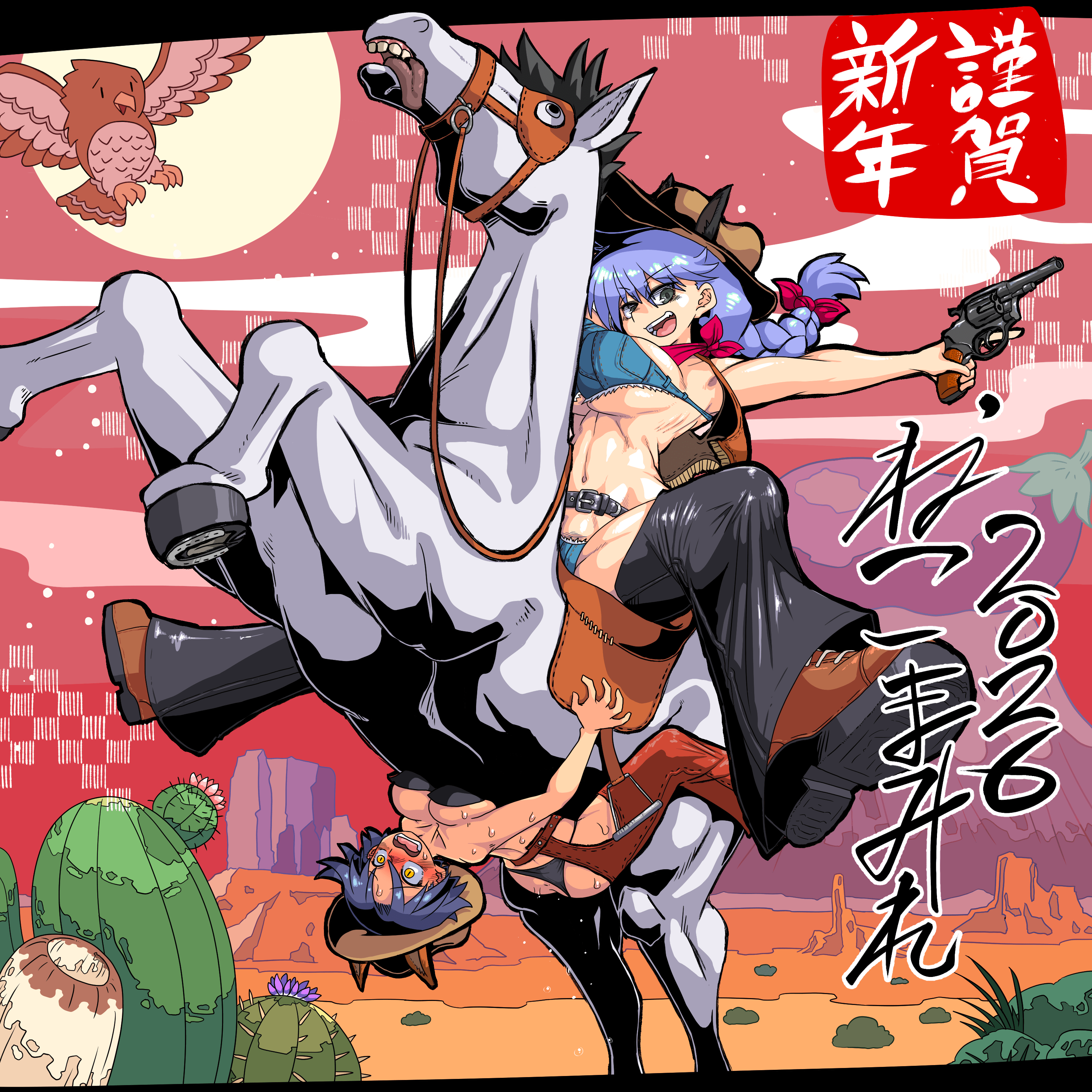 $dat=2026/01/01_top2601a.png $tag=正月 午年 カウボーイ 一富士二鷹三茄子 $omk=26010101.pngg $doc= 毎年正月は和を感じるテイストで行かせてもらっていますが、 ウマ年ばかりはスキヤキウェスタンでいかせてもらいますよ。 |